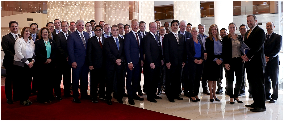 Back Row L to R: Tony Gioiello Port of Los Angeles (POLA), Huang Heng (SIPG), Arley Baker (POLA), Chris Chase (POLA), Marcel VanDijk (POLA), Daniel Oliver Port of Montreal, Steve Abraham Hutchinson Ports, Lance Kaneshiro (POLA), David Casey (POLA), Bin Liu CWCCT Port of Shenzhen, Yisong Zhao CWCCT Port of Shenzhen, Marla Bleavins Port of Los Angeles (POLA), Sebastian Saxe, PhD, CIO/CDO, Hamburg Port Authority, Piet Opstaele, CIO, Antwerp Port Authority, Rio Natalianto (IPC), Mike DiBernardo (POLA). Front Row L to R: Eric Caris (POLA), Thomas Gazsi (POLA), Elvyn Masassya Indonesia Port Corp (IPC), Santiago Garcia-Mila, Deputy General Manager, Barcelona Port Authority and President of the International Association of Ports and Harbors (IAPH), Jens Meier, CEO, Hamburg Port Authority, Gene Seroka, CEO, Port of Los Angeles, Yan Jun Deputy Secretary of CPC SIPC Committee, Shanghai Intl. Port Group (SIPG), Iris Scheel HPA, Kareen Gray GE Transportation, Kieran Ring, CEO, Global Institute of Logistics,